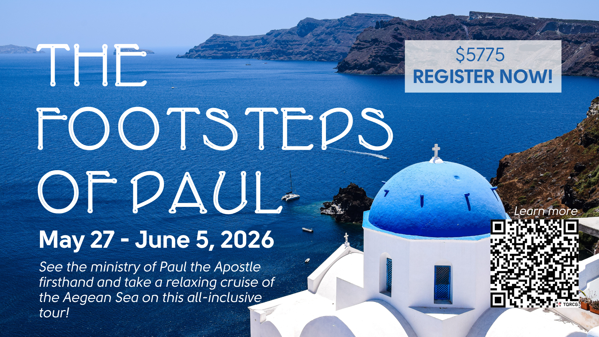 Walk in the Footsteps of Paul: Register now for our 10-Day Greece (& Turkey) trip in 2026! Journey through the Aegean Sea on this all-inclusive biblical trip, visiting the sacred sites where Paul the Apostle ministered. This unique tour combines spiritual discovery with the comfort and relaxation of cruising the beautiful Mediterranean, featuring evening activities and guided tours of major biblical sites. Click here for a detailed daily itinerary and booking information. The cost is $5775 a person.