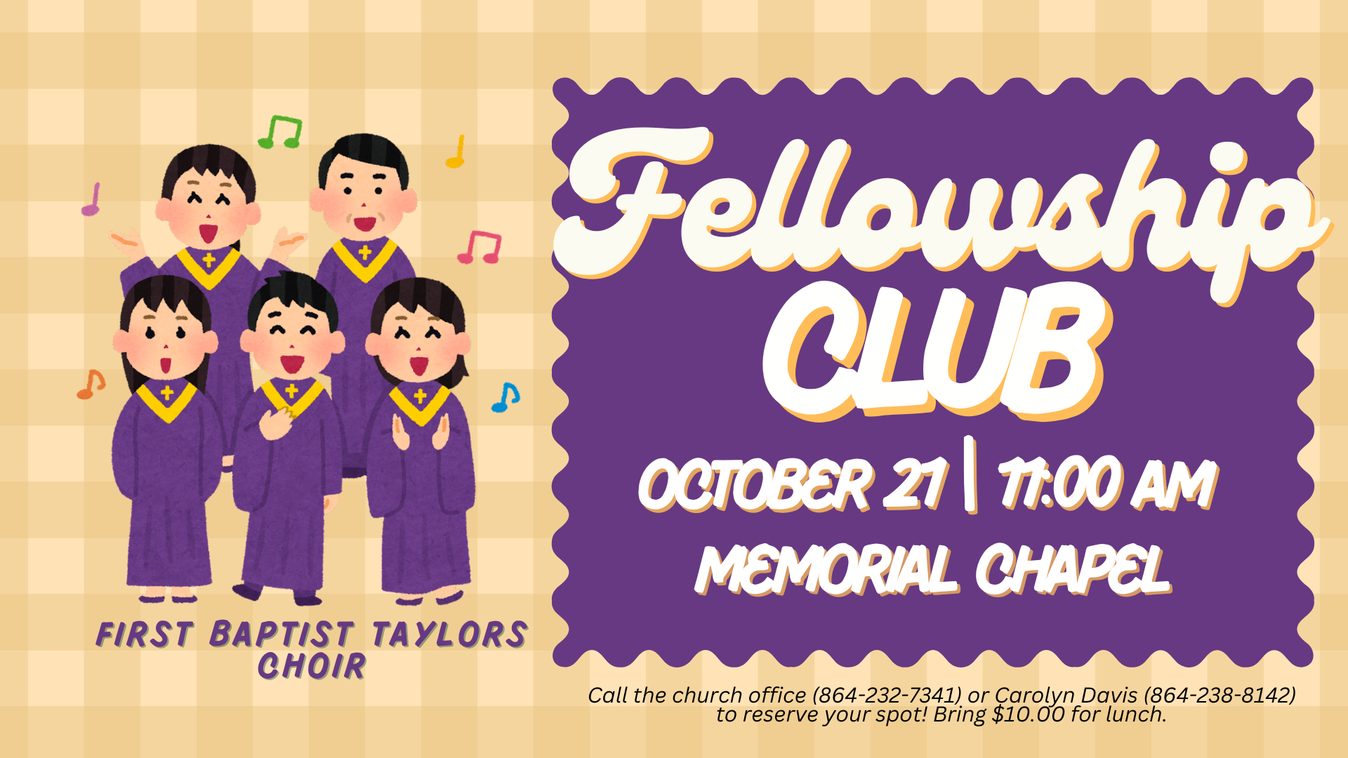 The Fellowship Club will have their next gathering on October 21 in Memorial Chapel and enjoy the gift of music with special guests from the First Baptist Taylors Choir. Join us at 11:00 AM and then eat lunch in the Truluck Room immediately following our music program. Call the church office (864-232-7341) or Carolyn Davis (864-238-8142) to reserve your spot! Cost is $10.00 to cover lunch.