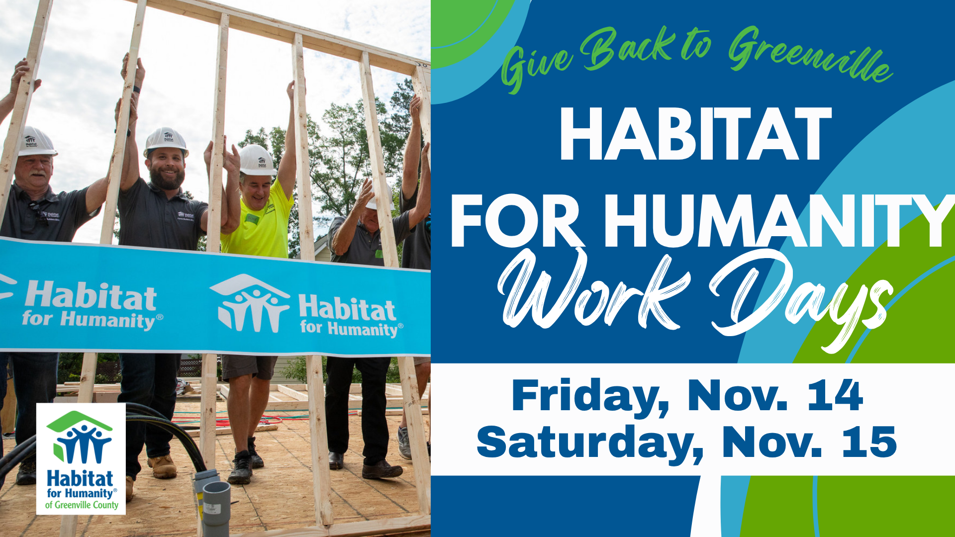 Give back to Greenville with us on Friday, November 14 or Saturday, November 15 as we partner with Habitat for Humanity for two volunteer work days.