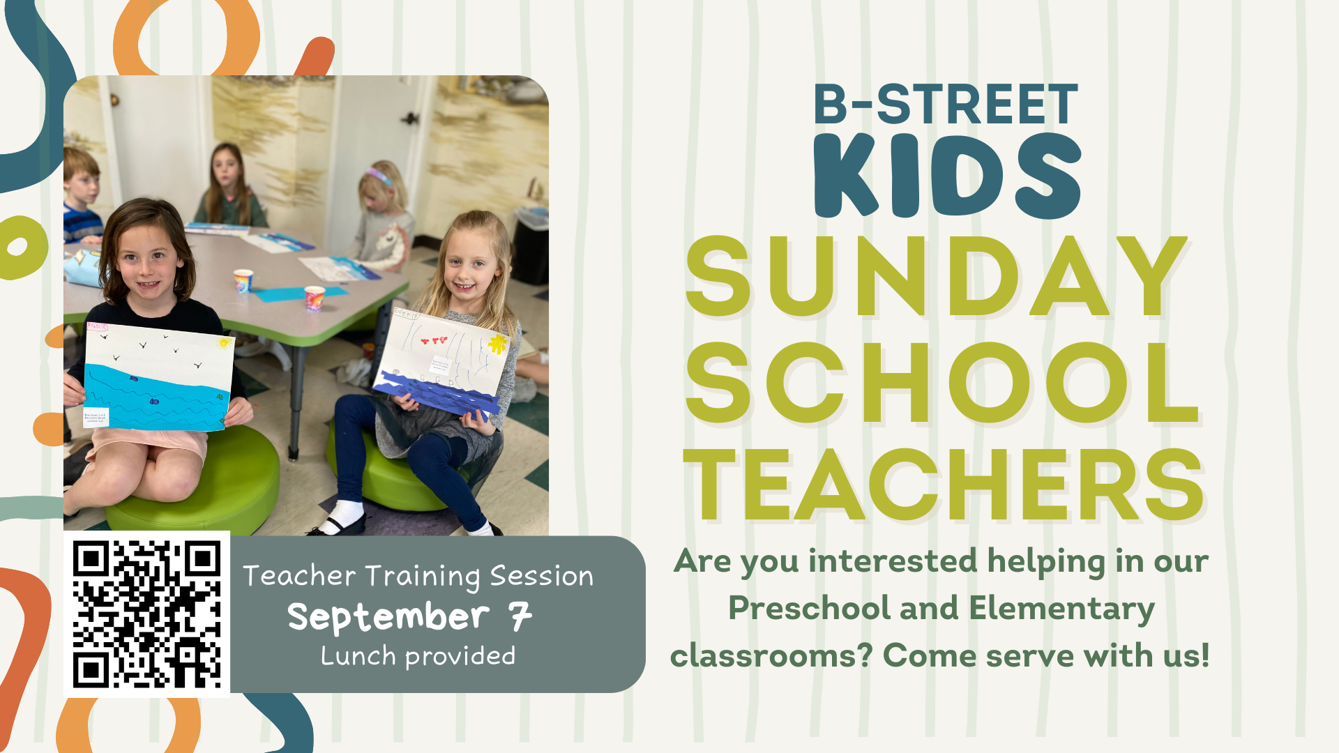 B-Street Kids Ministry is looking to build our Team of loving Sunday School teachers for the new school year! Lessons and activities are provided each week. We have a Teacher Training Session on Sunday, September 7. Sign up below if you are interested in serving with us!