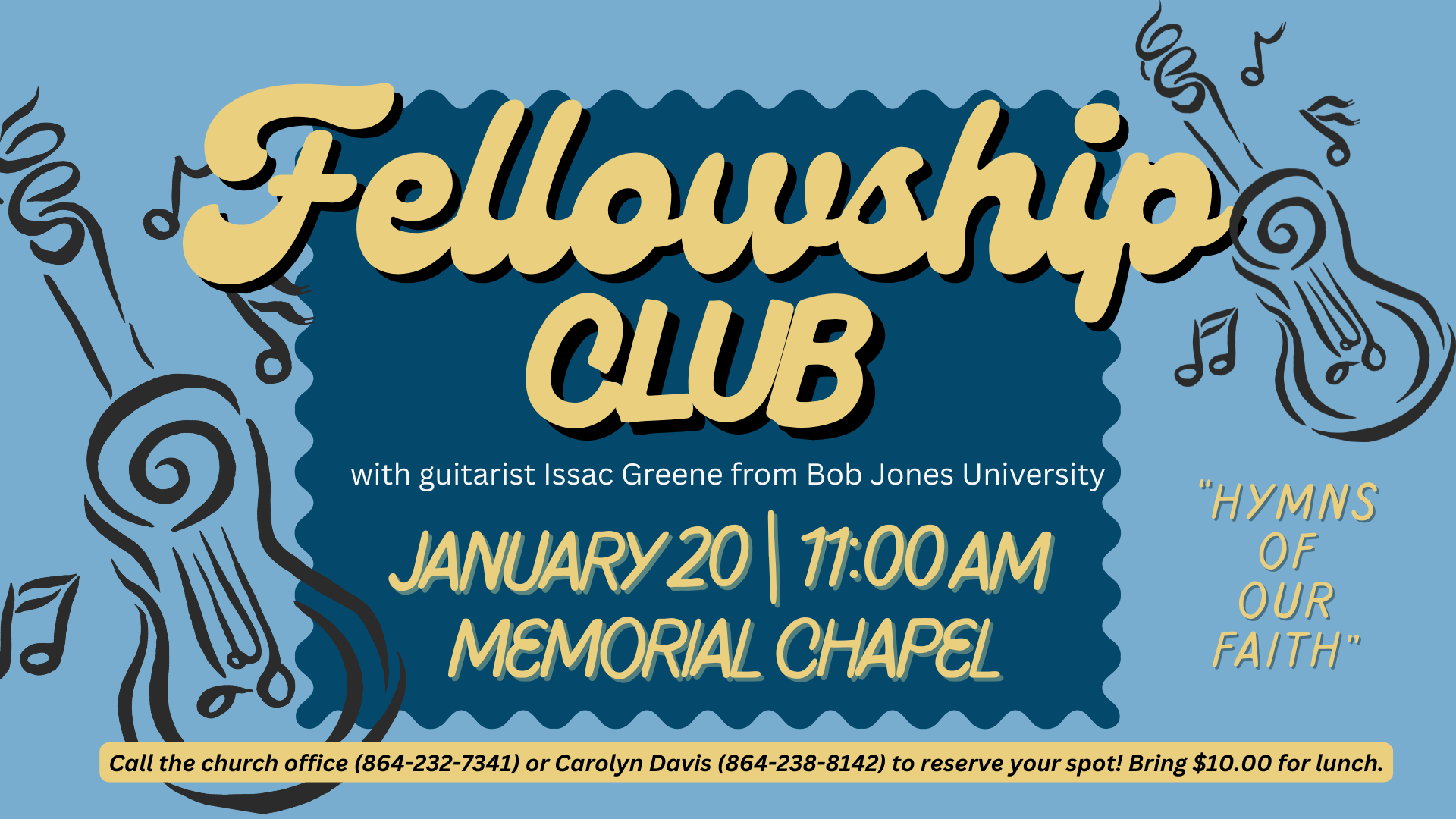 Join us for “Hymns of our Faith” at our January Fellowship Club meeting! Issac Greene, a talented guitarist from Bob Jones University’s Music Faculty, will share an inspiring program of beloved hymns. Let the timeless melodies of our faith uplift and encourage you through this gifted musician’s performance. Lunch will be served in the Truluck Room following the concert. Call the church office (864-232-7341) or Carolyn Davis (864-238-8142) to reserve your spot and bring $10.00 for lunch.