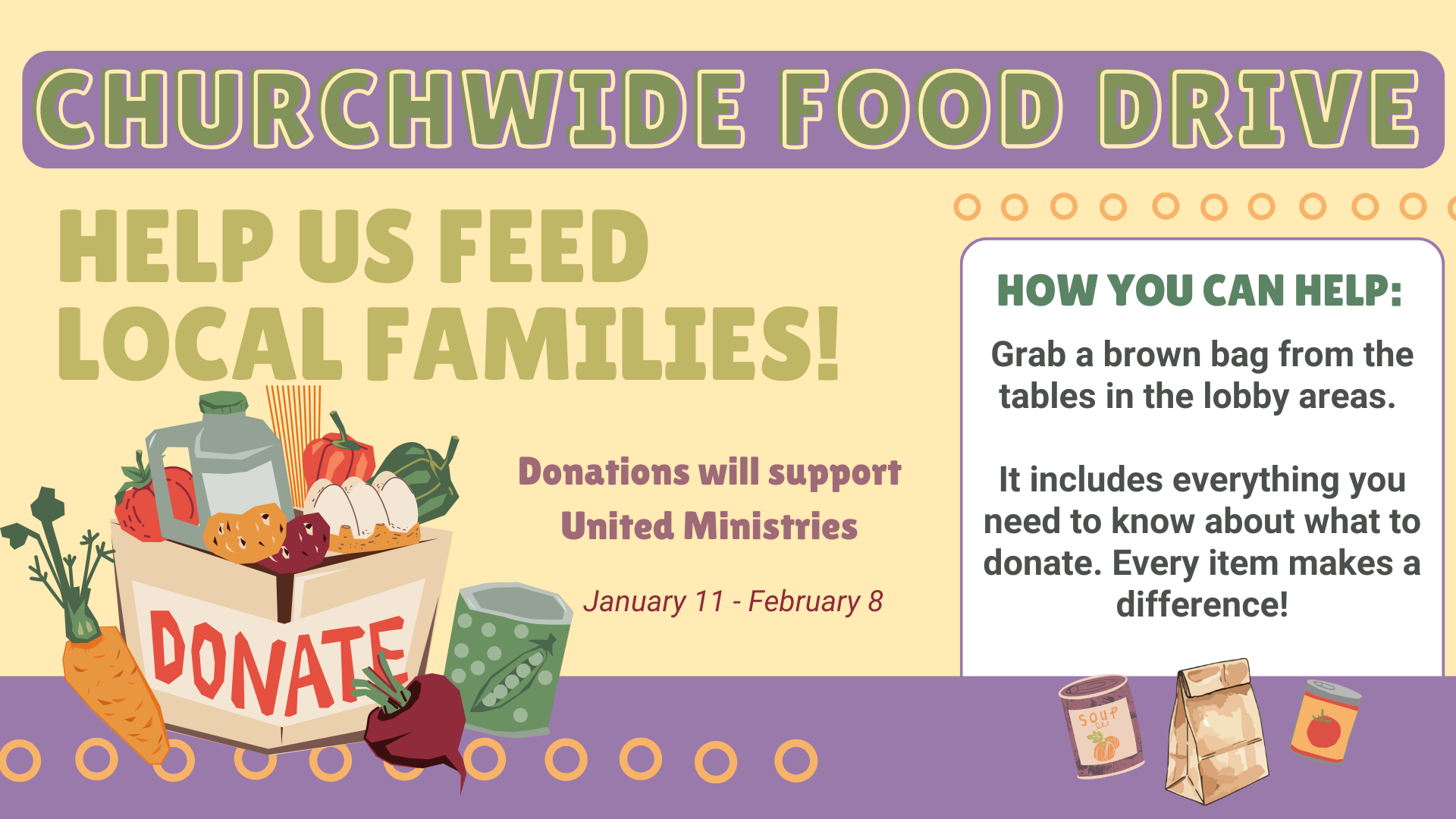 We are excited to announce our upcoming churchwide food drive to support United Ministries. After services this Sunday, please pick up a food drive bag ( or more!) in the lobby. You’ll find a list of suggested items and instructions on how to participate. This food drive will run through February 8, so don’t worry if you can’t grab a bag this weekend – we will have them available in the lobby areas throughout the month. Contact Lisa Nalley, Local Outreach Coordinator, if you have any questions.