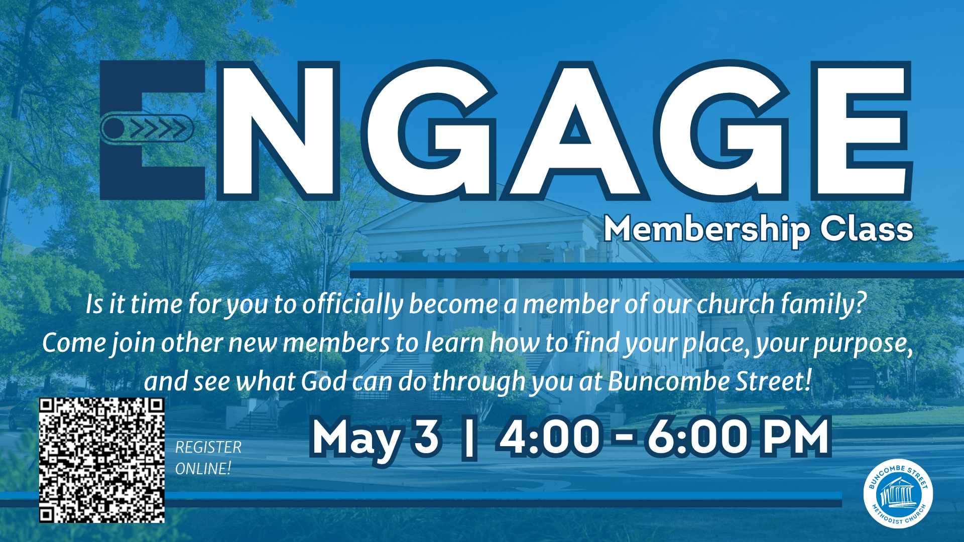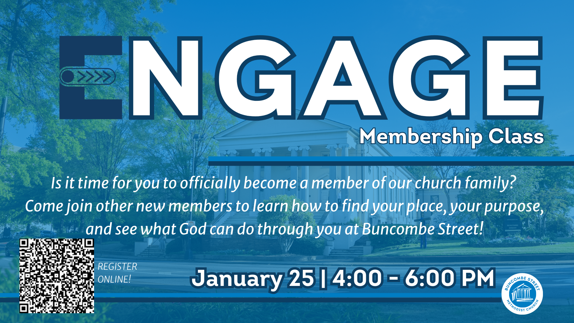 Is it time for you to officially become a member of our church family? We invite you to join us for our ENGAGE Membership Class! Alongside other new members, you’ll learn how to find your place, discover your purpose, connect with community, and take your next step.