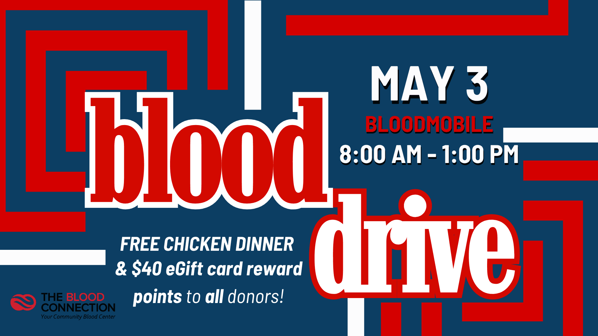 Donate to our spring Blood Drive! The Bloodmobile will be in our large parking lot across from the Sanctuary steps. One donation can save multiple lives, and as a bonus, donors receive a free chicken dinner and $40 in eGift card reward points!