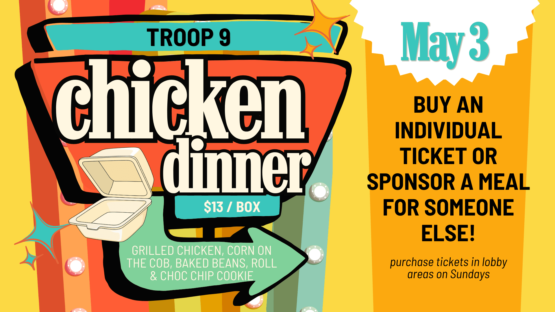 Troop 9 is giving away over 1,500 chicken dinners to local agencies and those in need on May 3, and they need your help to make it happen! Sponsor a meal or grab your own box lunch (grilled chicken, corn on the cob, baked beans, a roll, and a chocolate chip cookie) prepared with love. ($13) Get your tickets in the lobby areas on Sundays and contact Tim Poole if you have questions about sponsorship.