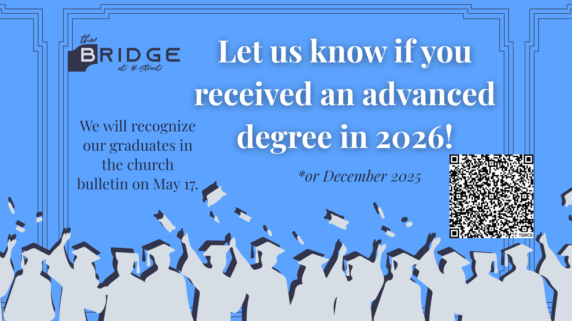 Hey Bridge at B-Street – if you are graduating with an advanced degree this spring or received an advanced degree in December 2025, please let us know so we can recognize you too! Don’t be shy – click below to fill out our form so we have your information for the bulletin on May 17.